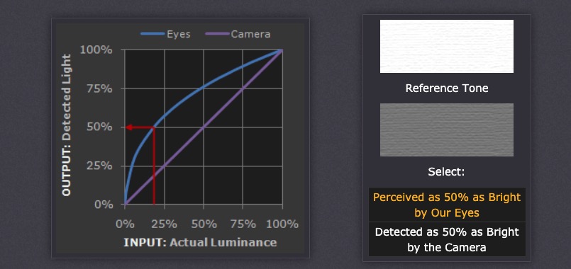 与相机相比,人眼对暗色调的变化比对亮色调的变化更敏感。这种特性有一个生物学上的原因: 它使我们的视觉能够在更广泛的亮度范围内工作。