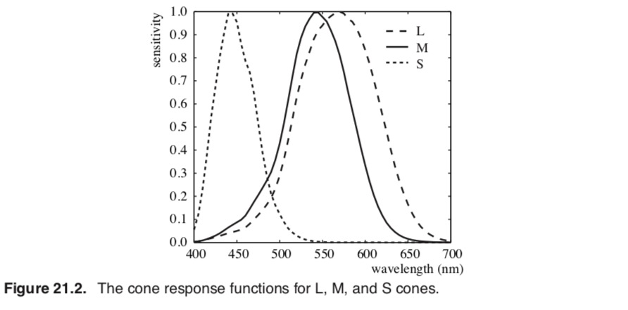 实际上在视网膜上存在着三种用来感知颜色的视锥细胞,他们分别叫做S(Short)-视锥细胞,M(Middle)-视锥细胞,L(Long)-视锥细胞,对应着波长的短,中,长。