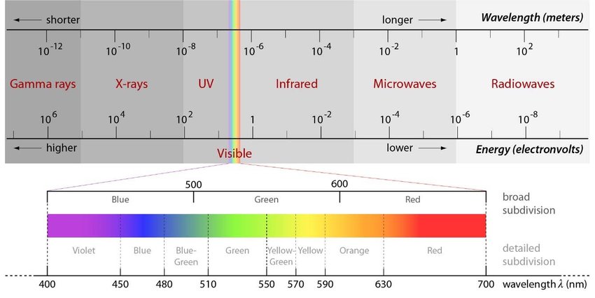 依照波长的长短、频率以及波源的不同,电磁波谱可大致分为:无线电波、微波、红外线、可见光、紫外线、x射线和伽马射线。