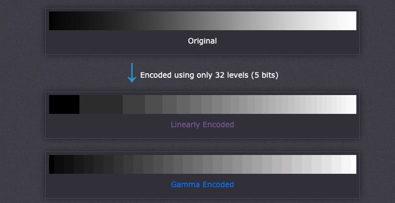 由于伽马编码将色调层次重新分配到更接近我们眼睛感知的层次,因此描述给定色调范围所需的比特更少。 也就是说,因为人眼对于暗色调更加敏感,伽马矫正就在暗色调区间划分了更多层,提高了存储空间的利用率。否则,过多的比特将用于描述较明亮的色调(相机相对更敏感,人眼较不敏感) ,而缺少比特将用于描述较暗的色调。