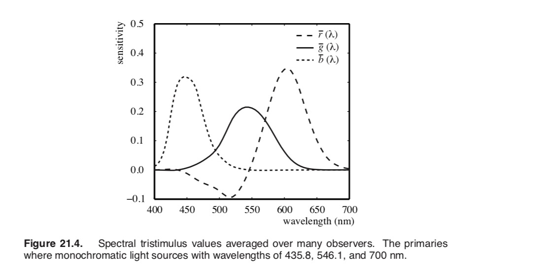 简单来说,就是认为调整三种不同波长的单色光(波长为分别为435.8, 546.1, 700 nm)的组合,使其和另一种颜色匹配(同色异谱:一种颜色的再现与观察颜色的光源特性有一定的关系。),然后记录下这个波段的光对应的三原色的系数。得到下面的曲线。