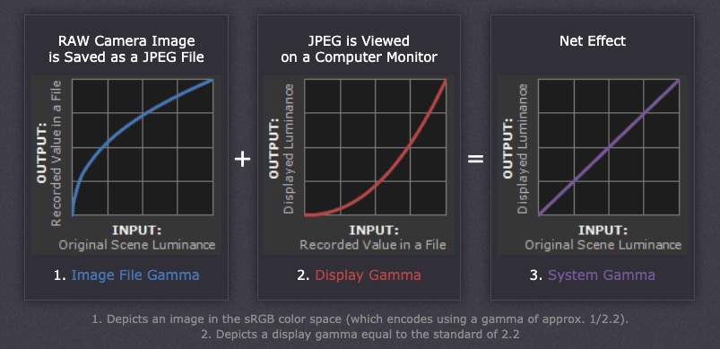 通常image gamma的设置嵌入在图像文件中,大多数图像设置gamma值为1/2.2,(如上图左一)。当相机将捕获的图像转换为标准JPEG或TIFF文件格式时应用gamma将本地相机的色调层次重新分配到感知更加均匀的层次中。