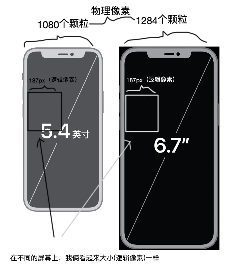 在不同设备逻辑像素相同则视觉尺寸相同,每一个逻辑像素包含物理像素点不一样多,包含越多物理像素点越多则越清晰。
