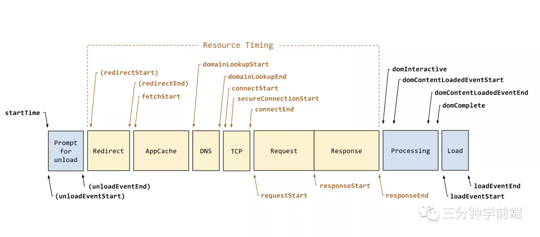 下图是 W3C 的 Navigation Timing 的处理模型,从当前浏览器窗口卸载旧页面开始,到新页面加载完成,整个过程一共被切分为 9 个小块: