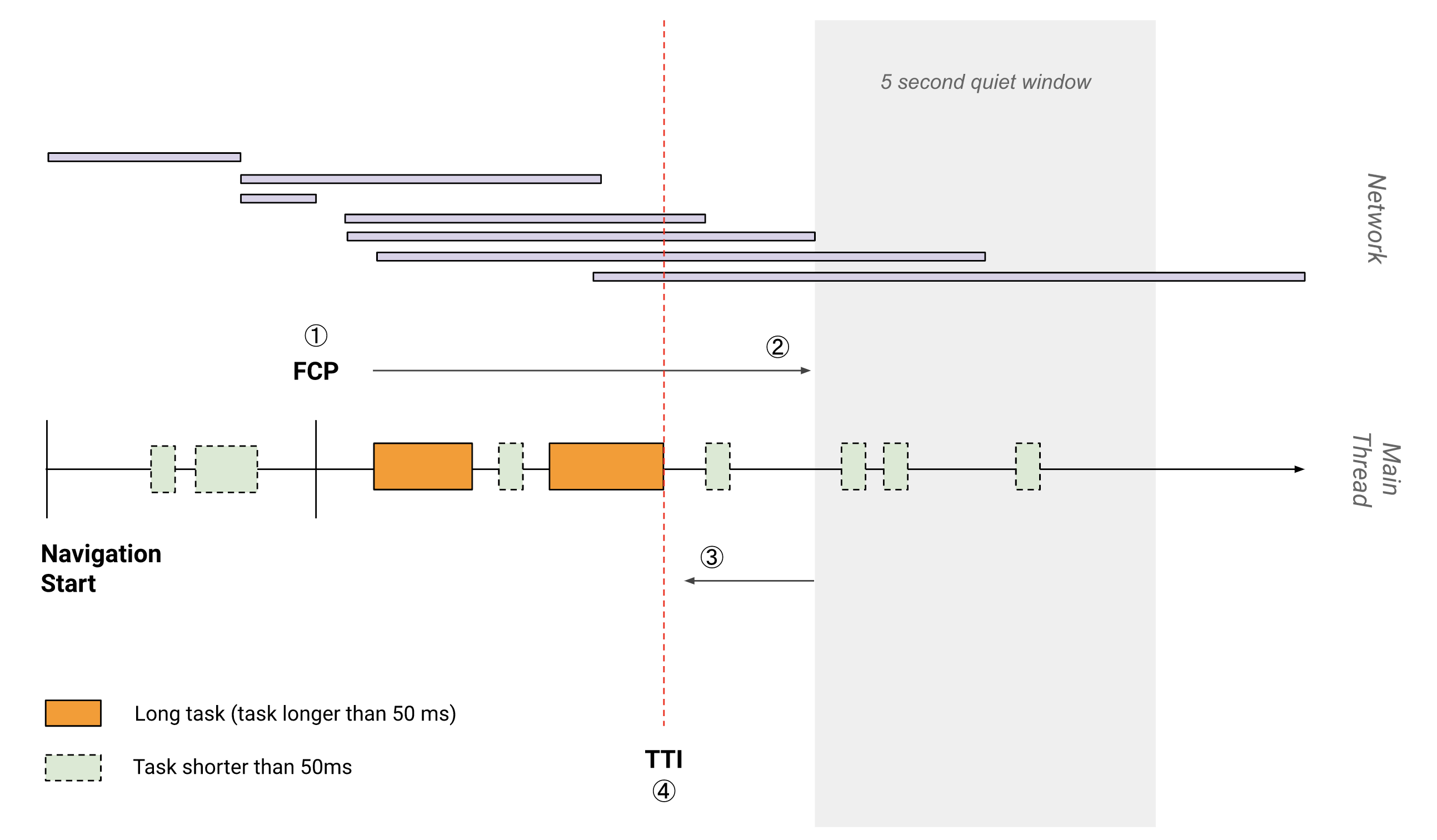 完全达到可交互状态的时间点是从 FCP 开始,在最后一个长任务(Long Task)完成的时间,并且在随后的 5 秒内网络和主线程是空闲的,如下图:
