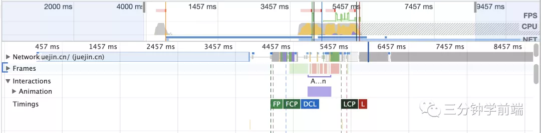 这两个指标看起来大同小异,但是FCP发生的时间一定大于等于FP,如下图是掘金的指标: