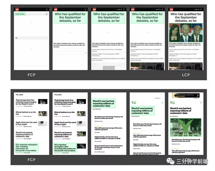 First Meaningful Paint,是指页面的首要内容出现在屏幕上的时间,对于不同的站点,首要内容是不同的,例如: