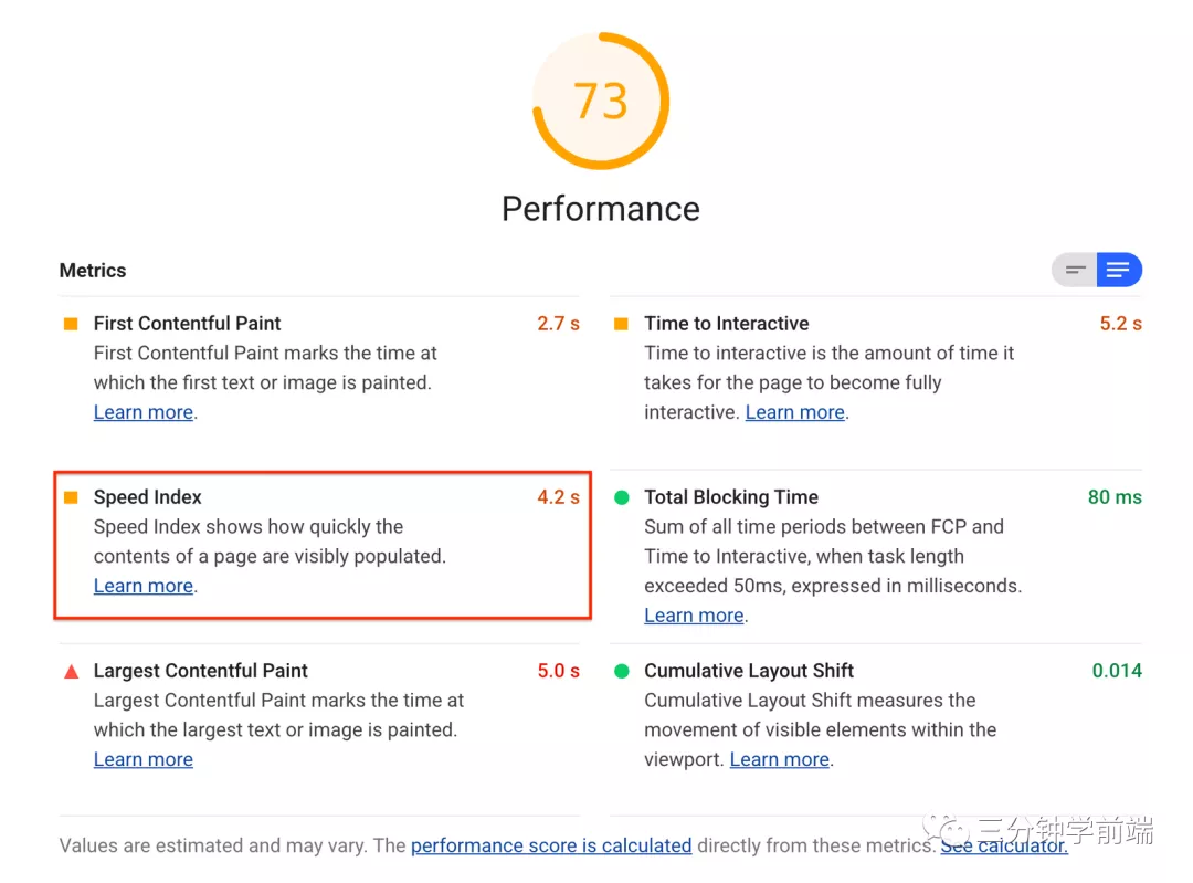 Speed Index,用于度量页面加载过程中内容可视化显示的速度,是 Lighthouse 的六个度量标准之一。