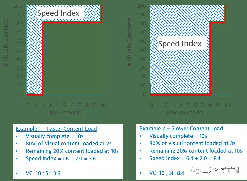 上图中的两个都是在 10s 时页面填充完成,但Example 1(左图)在 2s 是就已经填充了 80% 的内容,而 Example 2(右图)在 8s 时才填充 80%。